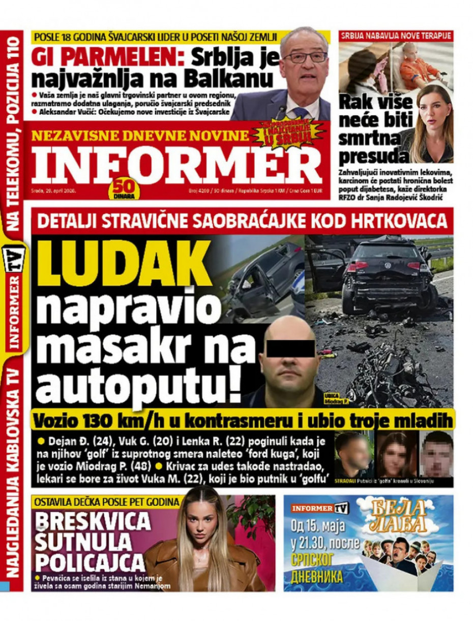 Naslovne strane dnevne štampe za sredu, 29. april