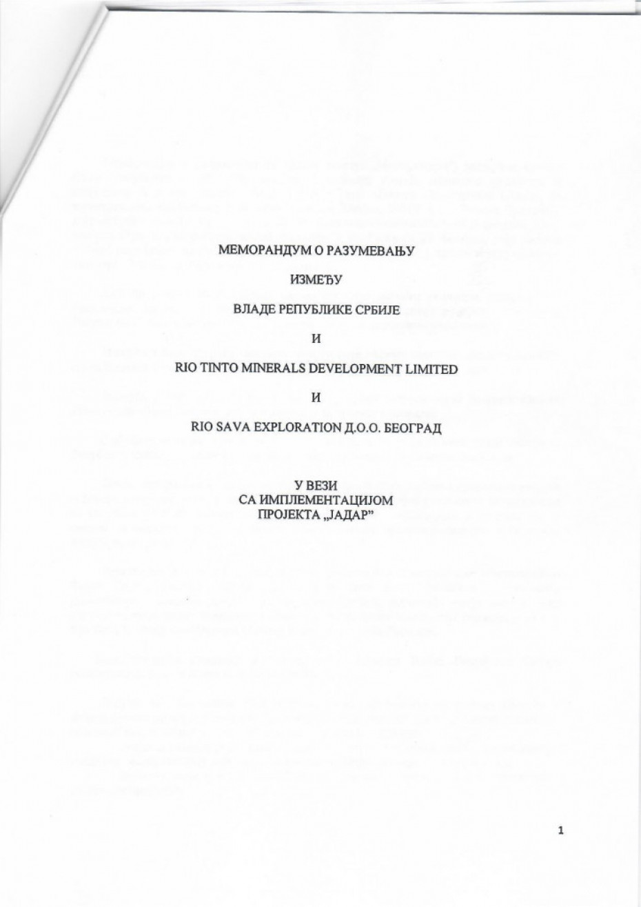 U tom dokumentu koji je zaključen između Vlade Srbije i kompanije Rio Tinto Minerals Development Limitid 24. jula 2017. se navodi da će radi realizacije saradnje Vlada Srbije preduzeti aktivnosti na obrazovanju zajedničke radne grupe sa kompanijom Rio Tinto čiji je cilj da nadgleda, unapređuje i poverava implementaciju ključnih aspekata Projekta "Jadar".