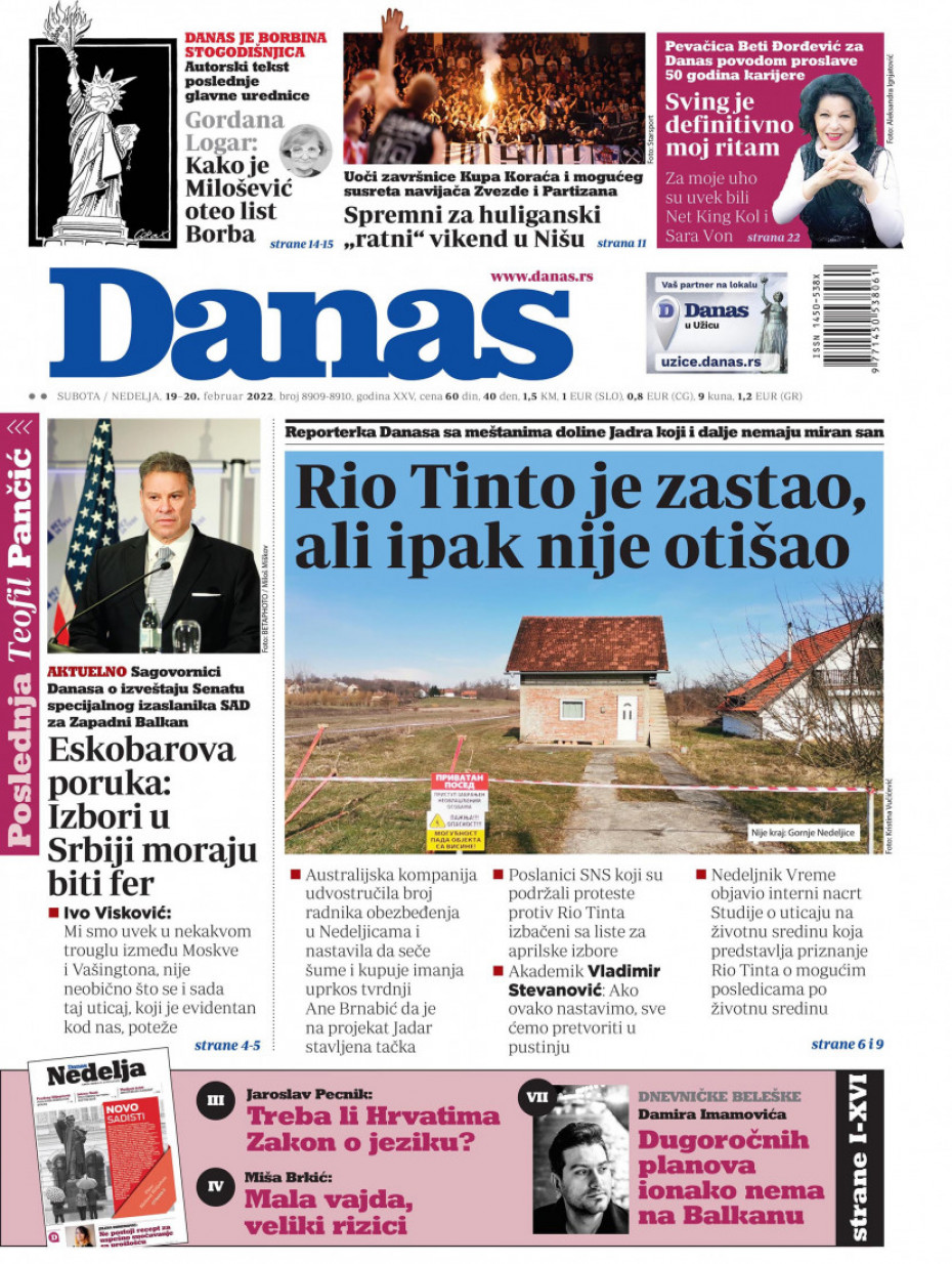 Naslovne strane dnevne štampe za nedelju, 20. februar
