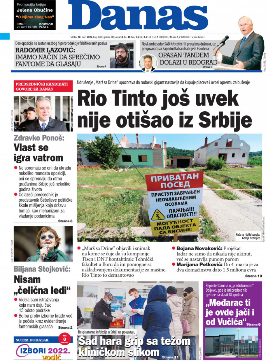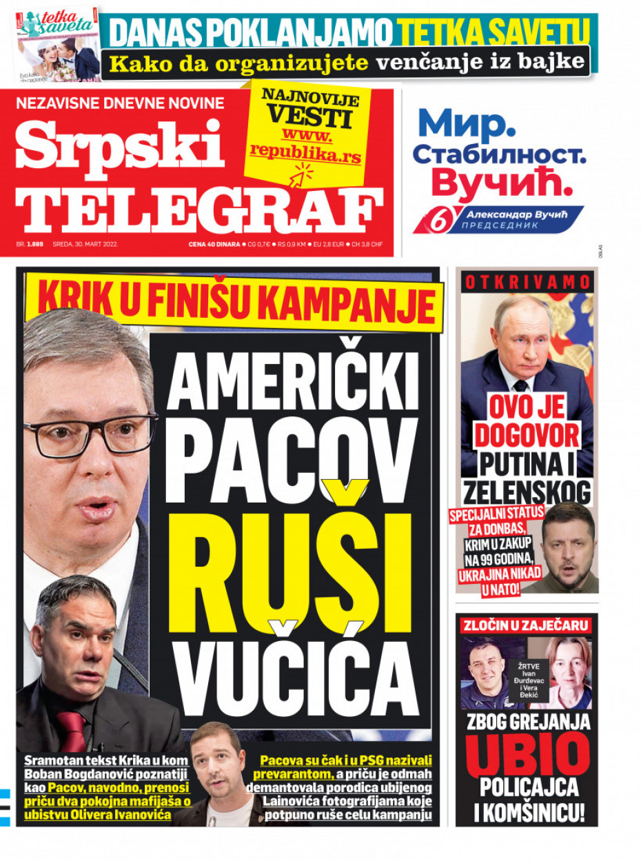 Naslovne strane dnevne štampe za sredu, 30. mart