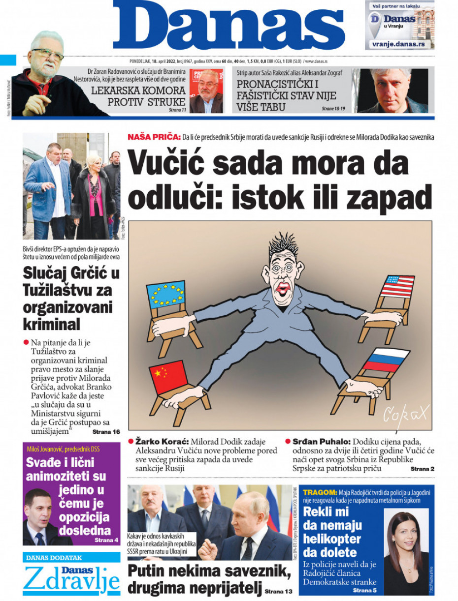 Pogledajte šta na naslovnim stranama donose dnevne novine u Srbiji u izdanju za ponedeljak, 18. april.