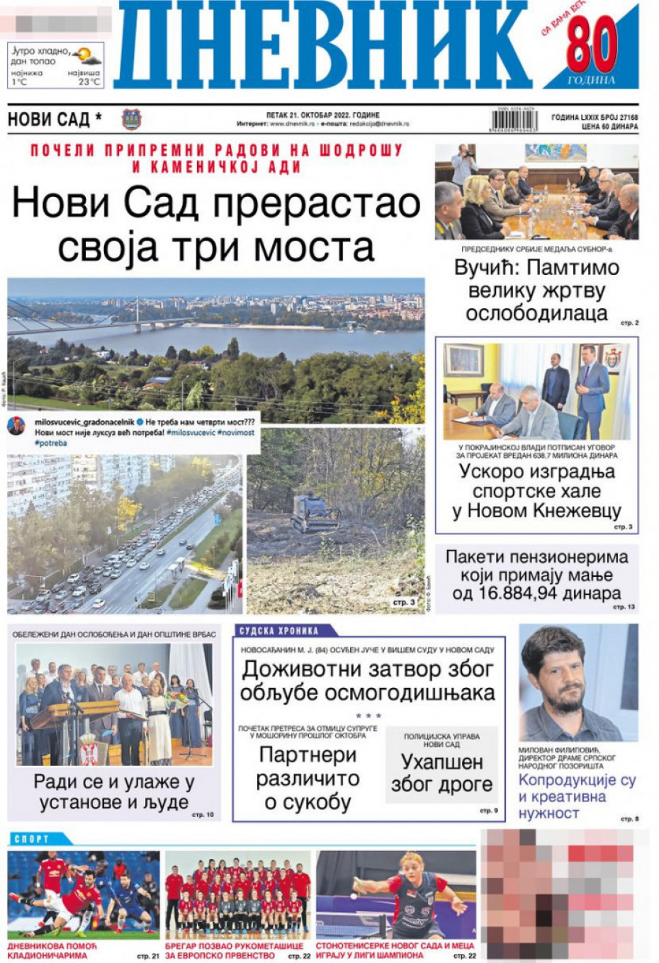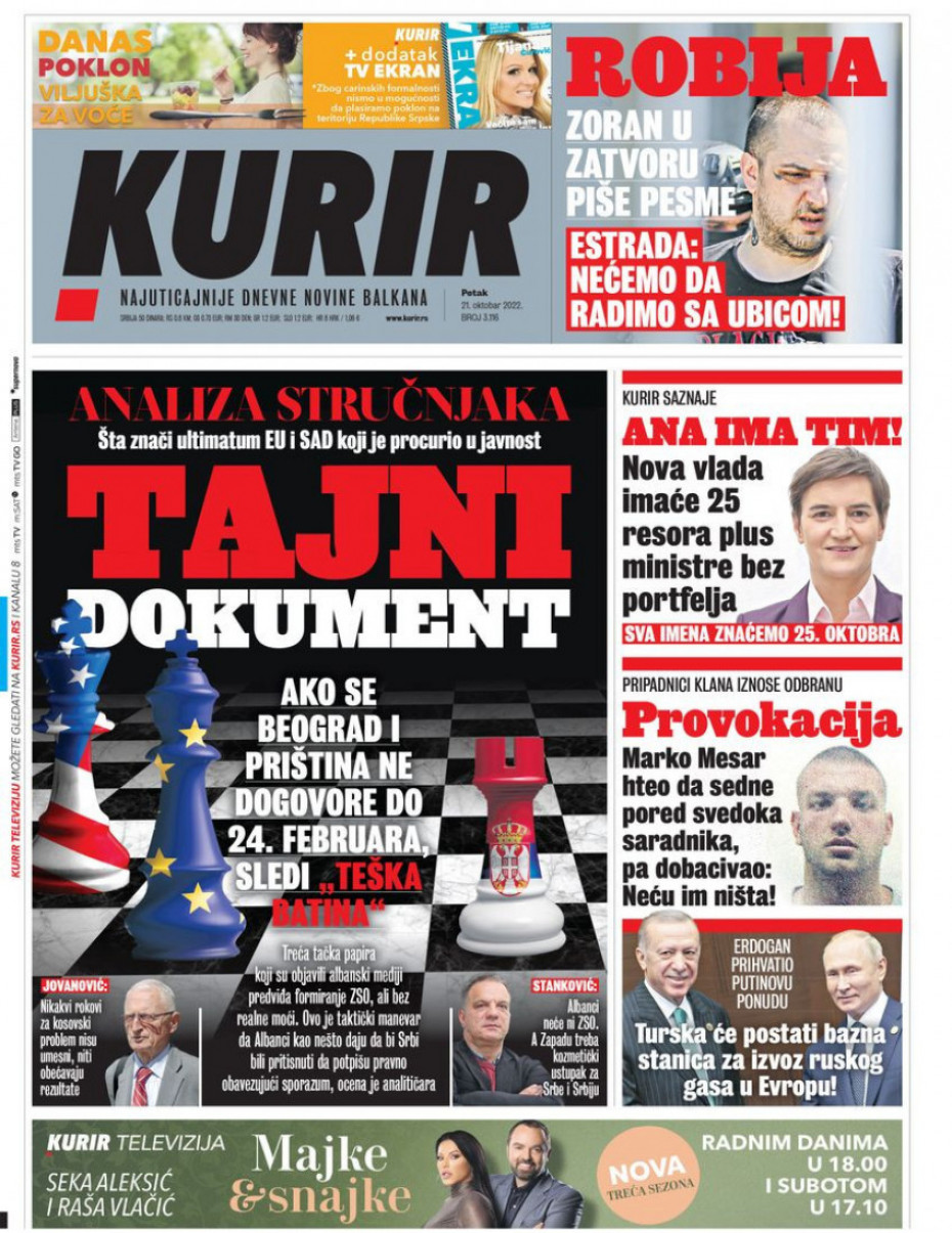 Pogledajte šta na naslovnim stranama donose dnevne novine u Srbiji u izdanju za petak, 21 oktobar.