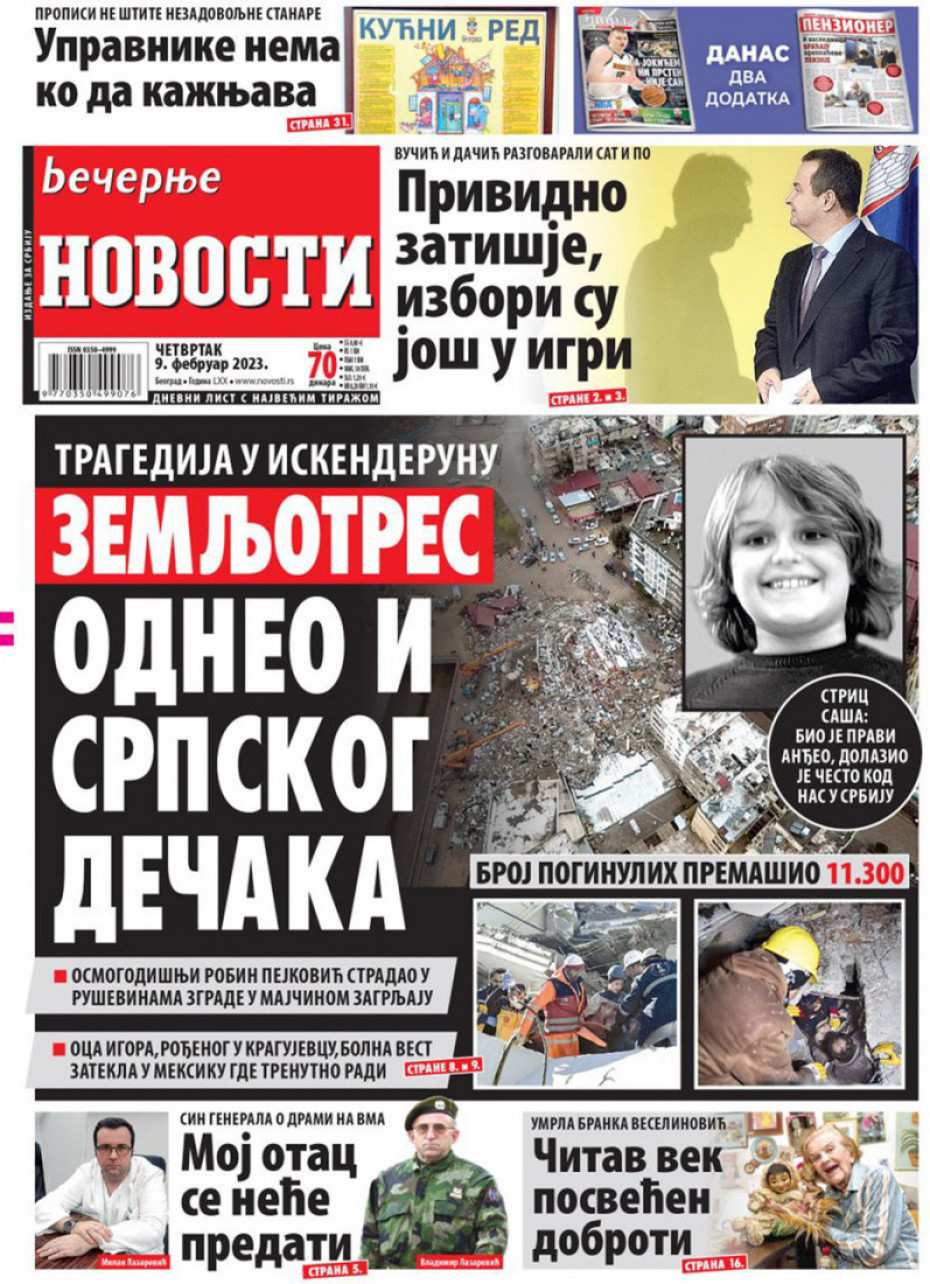 Naslovne strane dnevne štampe za četvrtak, 9. februar