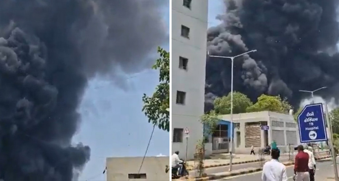 Snimci koje je objavila novinska agencija PTI pokazuju zapaljene ostatke aviona, sa gustim crnim dimom koji se diže u nebo u blizini aerodroma.
