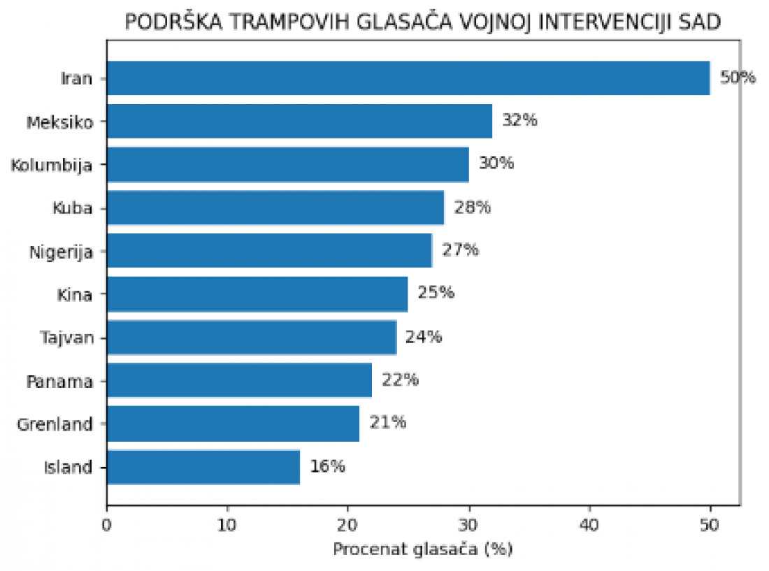 Nova anketa portala Politico pokazuje da 65 odsto Trampovih birača podržava da SAD preduzmu vojnu akciju protiv barem jedne od nekoliko potencijalnih meta, uključujući Iran, Grenland, Kubu, Kolumbiju, Kinu i Meksiko.