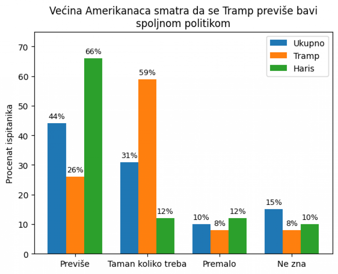 Ali među biračima koji su ga podržali na izborima 2024, 59 odsto smatra da je posvetio pravu količinu vremena međunarodnim temama, u poređenju sa samo 26 odsto onih koji brinu zbog fokusa na inostranstvo.