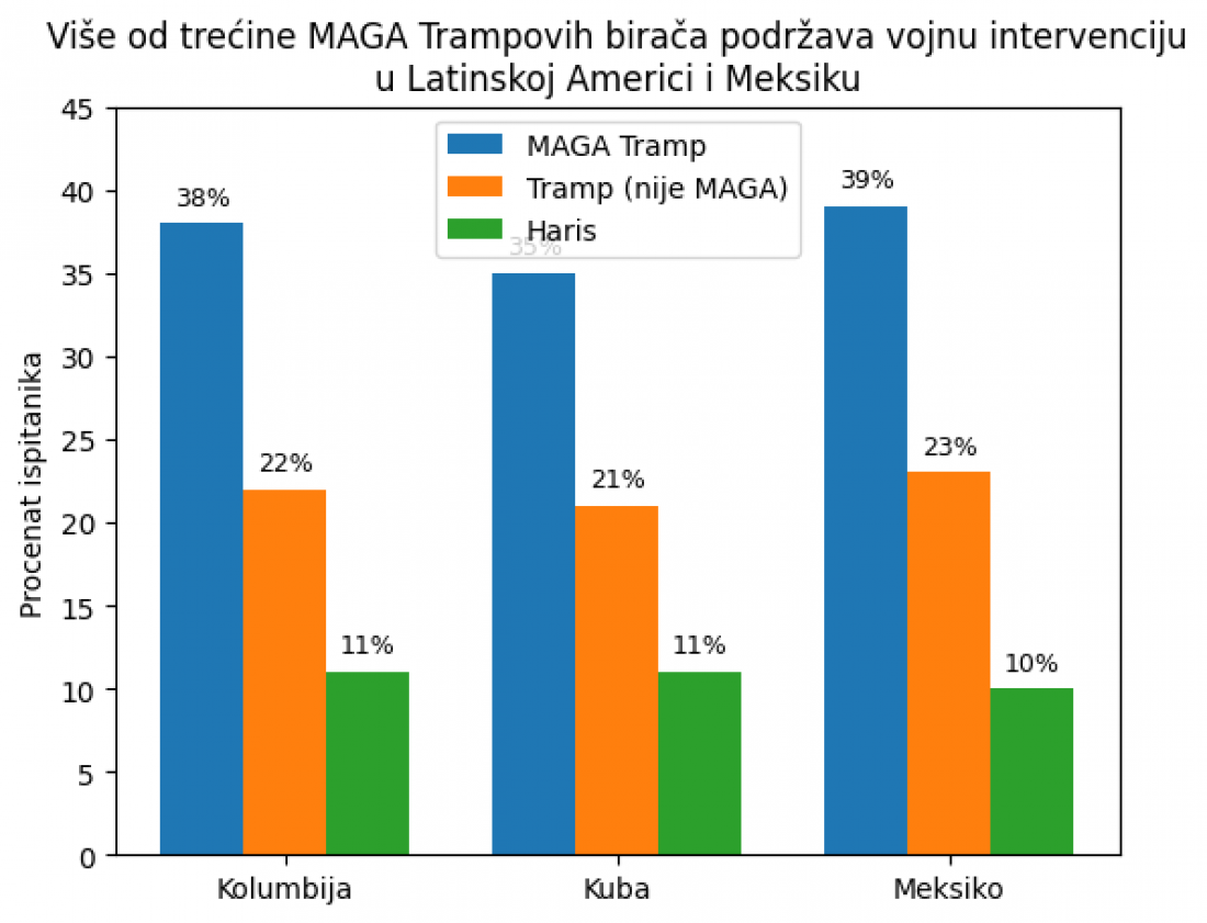 Trideset dva odsto birača Trampa podržalo je vojnu intervenciju u Meksiku, 30 odsto u Kolumbiji, dok je 28 odsto reklo da bi SAD trebalo vojno intervenisati na Kubi.