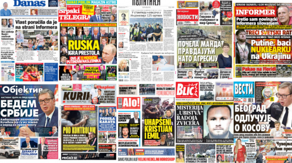 Politika Naslovne strane dnevne štampe za subotu, 10. decembar Pogledajte šta na naslovnim stranama donose dnevne novine u Srbiji u izdanju za subotu, 10. decembar. 09/12/2022 20:37 https://www.euronews.rs/srbija/politika/71516/naslovne-strane-dnevne-stampe-za-subotu-10-decembar/vest pročitaj celu vest