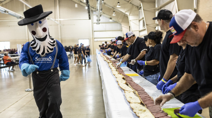 Život U slavu lokalnog recepta: Sendvič dugačak skoro 46 metara predstavljen na sajmu u Pensilvaniji Tim je za pripremanje sendviča koristio 600 kriški sira i 1.200 kriški originalne libanske bologne. 27/07/2023 22:51 https://www.euronews.rs/magazin/zivot/94807/u-slavu-lokalnog-recepta-sendvic-dugacak-skoro-46-metara-predstavljen-na-sajmu-u-pensilvaniji/vest pročitaj celu vest